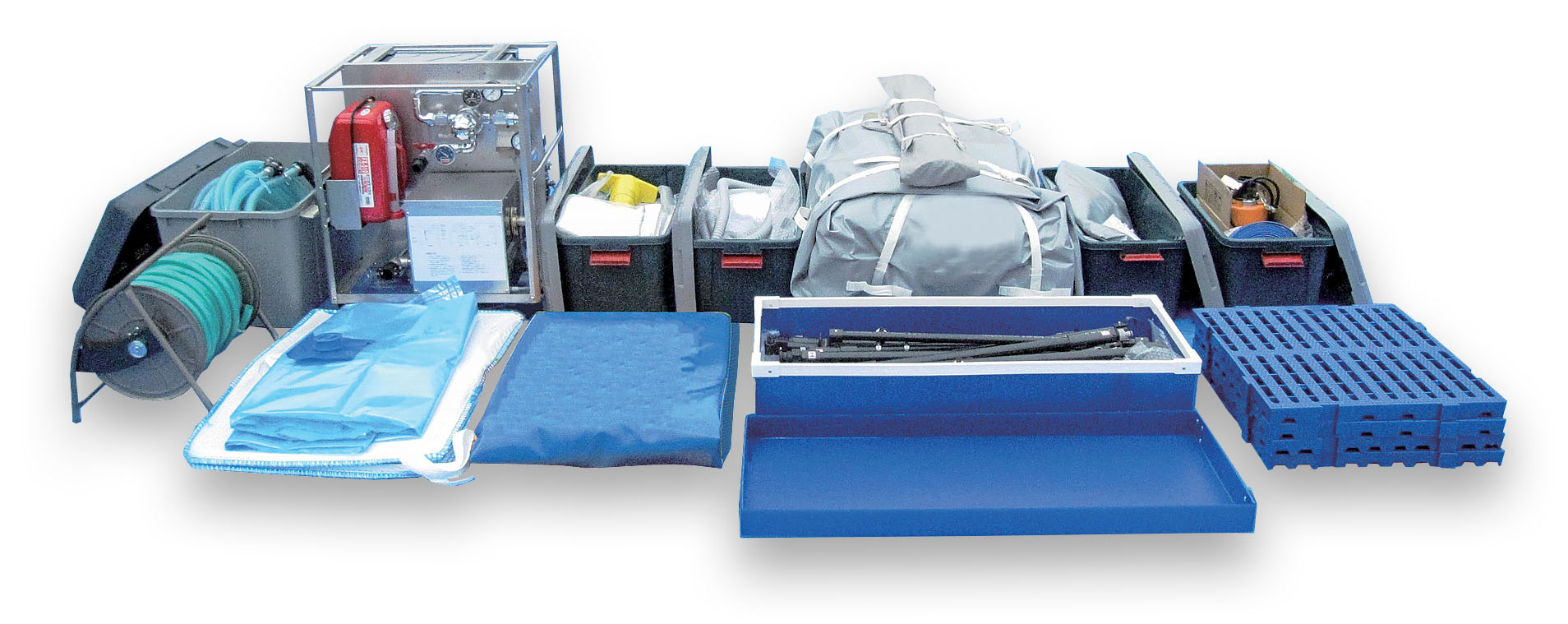 テント用間仕切り、シャワールーム用間仕切り、給水ホース、金具、標準付属品ボックス