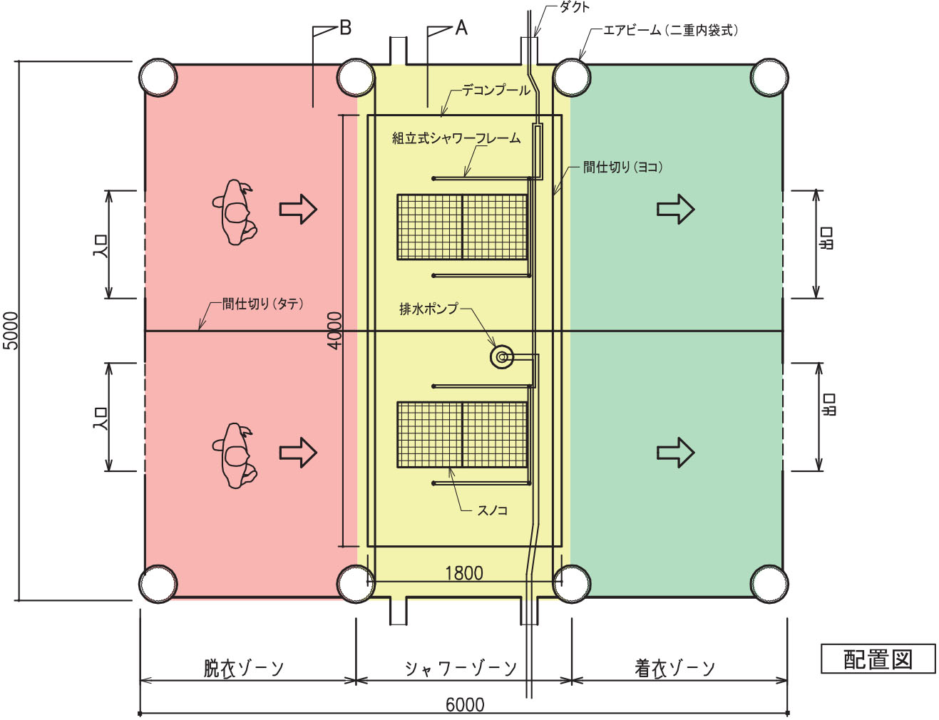 ・「脱衣ゾーン」「シャワーゾーン」「着衣ゾーン」も3 室からなる除染ラインを2 レーン設営可能。